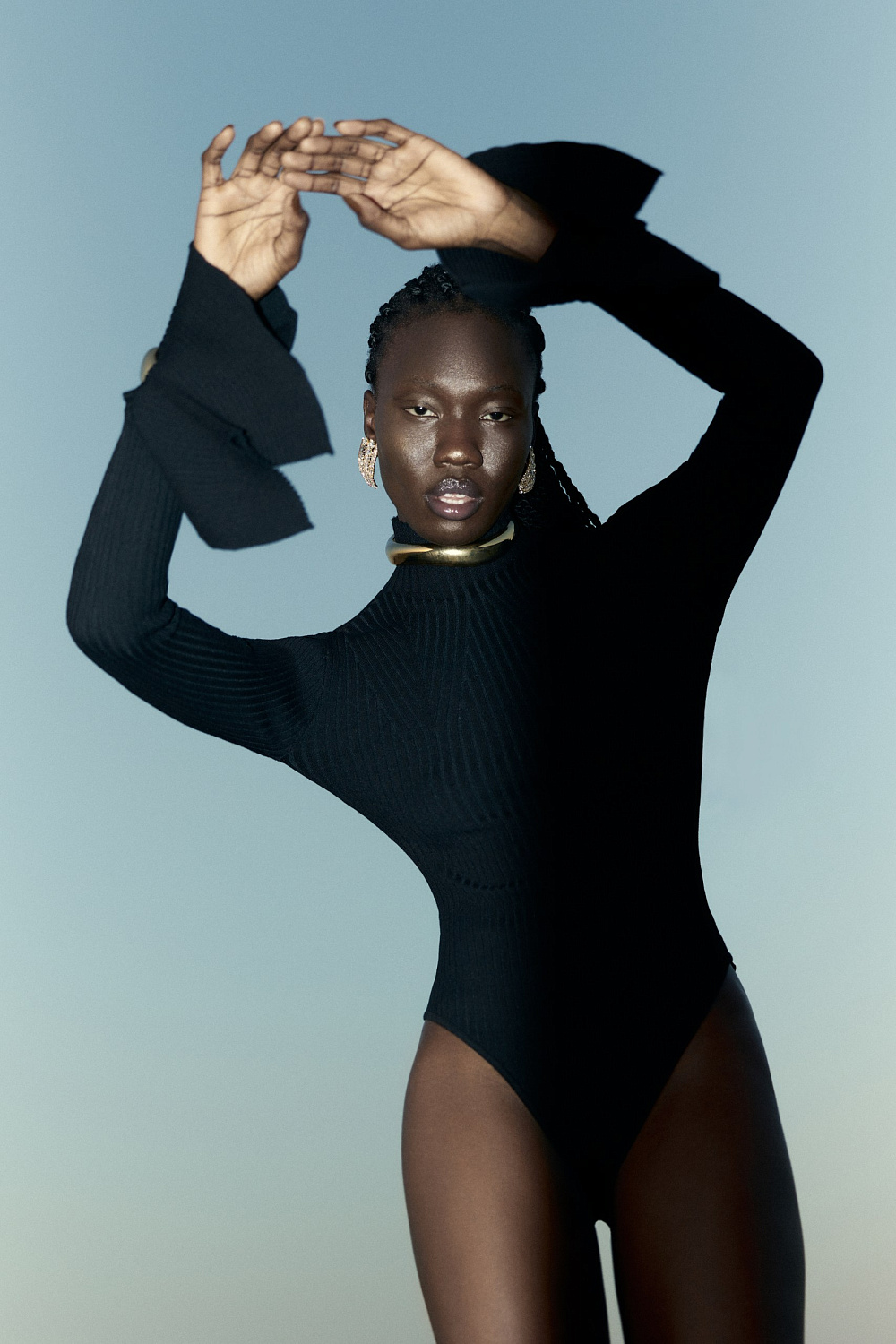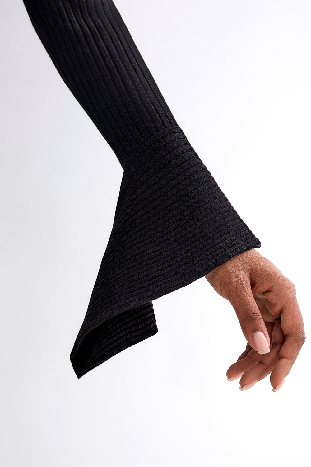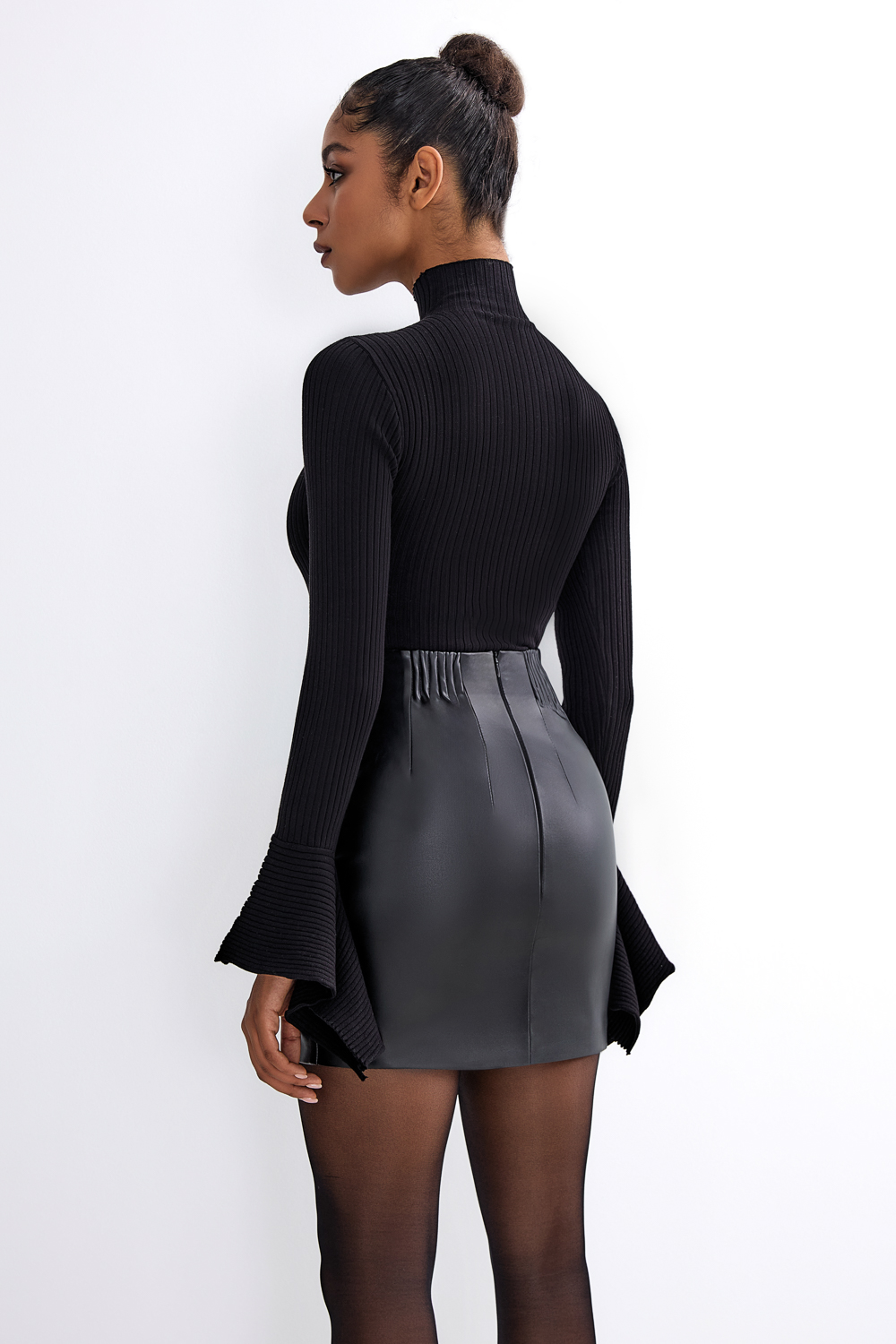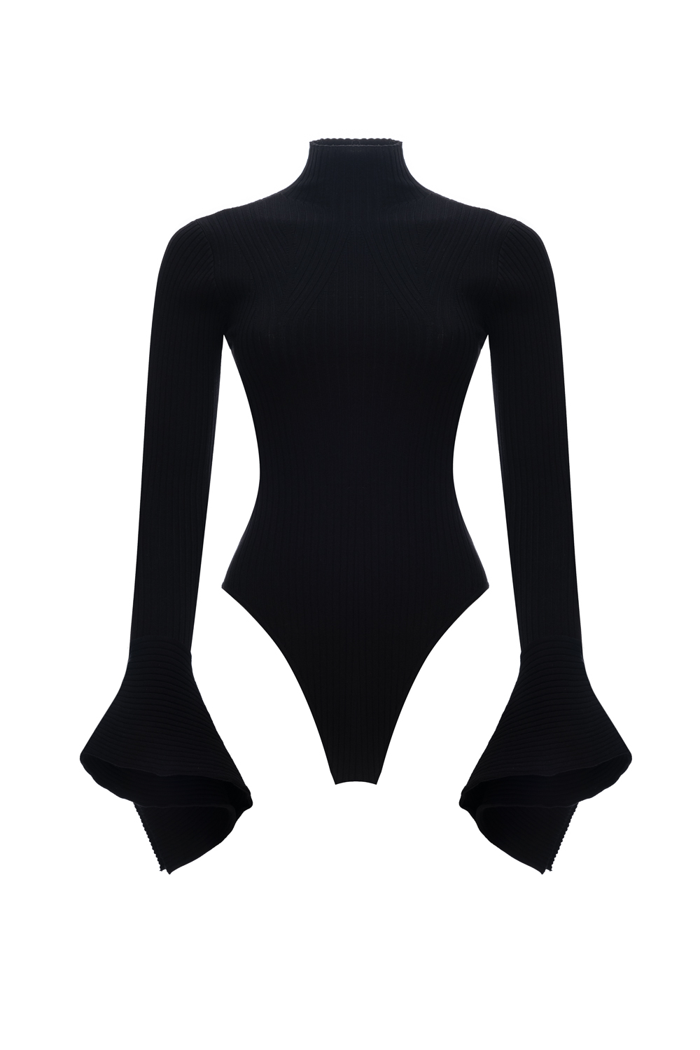 Трикотажное боди в рубчик с высоким воротником и оригинальными манжетами-лепесток. Застёгивается на 2 кнопки. Состав: 70% вискоза, 30% полиамид.