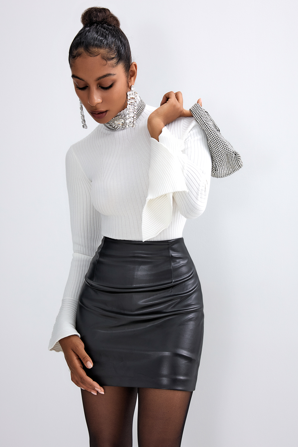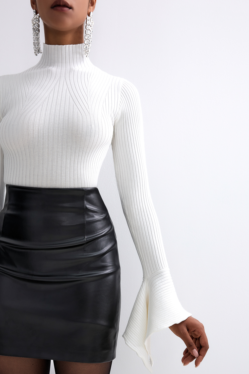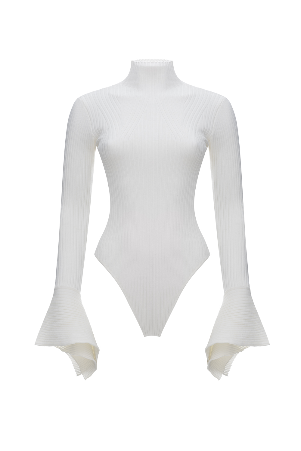 Трикотажное боди в рубчик с высоким воротником и оригинальными манжетами-лепесток. Застёгивается на 2 кнопки. Состав: 70% вискоза, 30% полиамид.