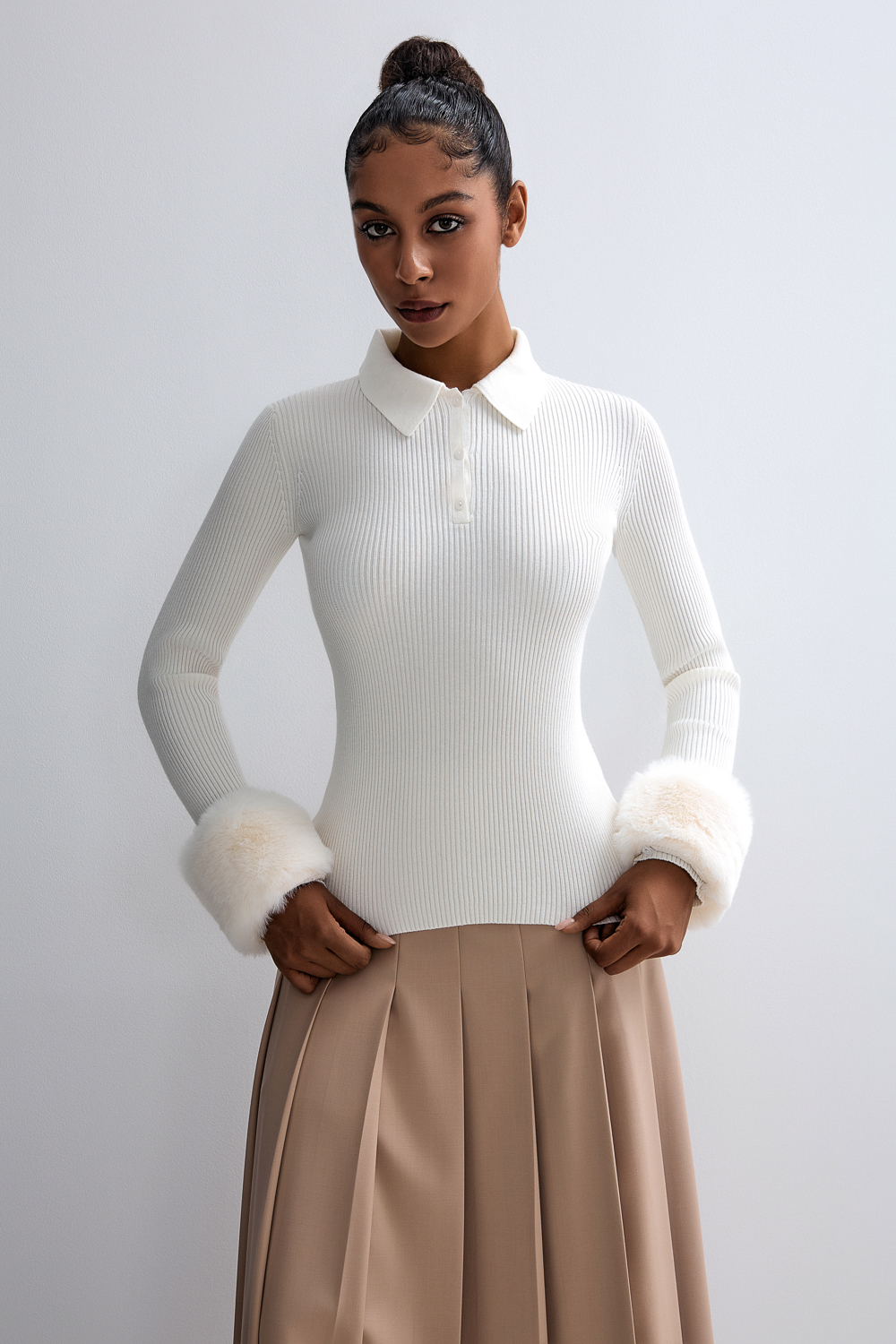 Трикотажная кофта поло в рубчик на пуговицах. Длинный рукав украшен искусственным мехом. Мех на рукавах — съемный. Длина по спинке 56 см, длина рукава 59 см. Состав: 45% вискоза, 29% полиэстер, 17% нейлон, 9% шерсть.