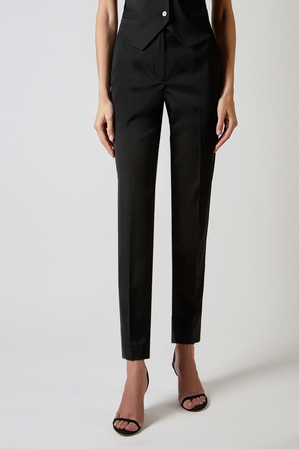 Классические rостюмные брюки с высокой посадкой и заутюженными стрелками. Длина от талии по внешнему шву 102 см. Состав: 63% вискоза, 32% полиэстер, 5% эластан.