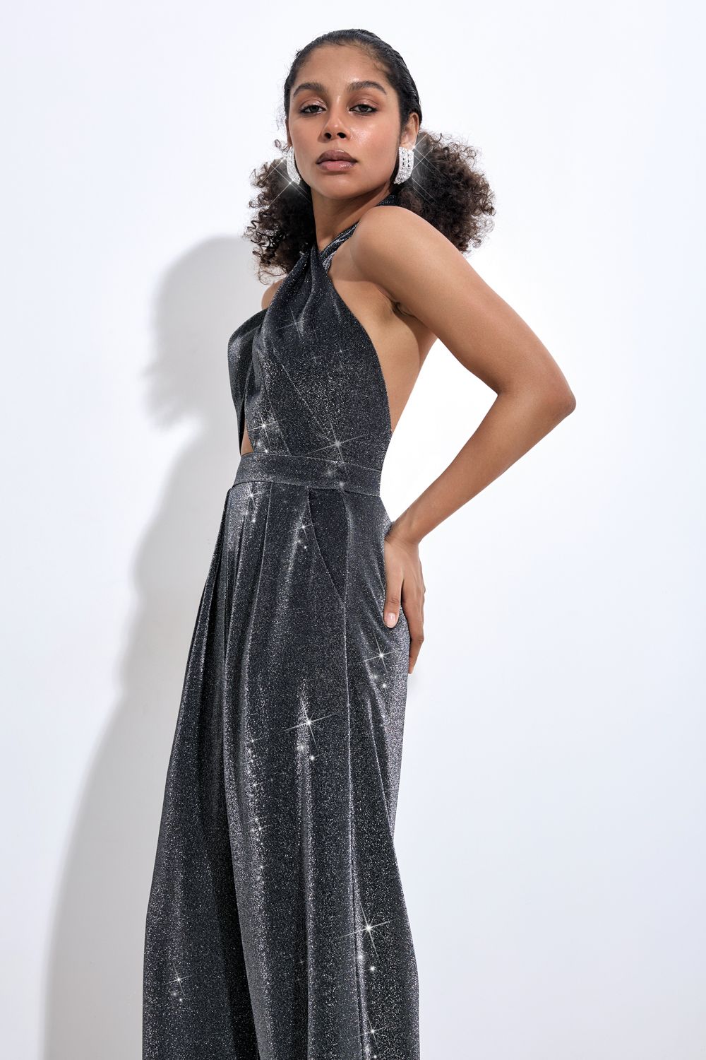 Праздничный комбинезон с широкими брюками и открытой спиной, выполненный из сверкающей ткани. Идеально подойдет для вечеринки или чтобы разнообразить повседневный наряд. Состав: 86% нейлон, 14% люрекс. Подкладка: 100% нейлон.
