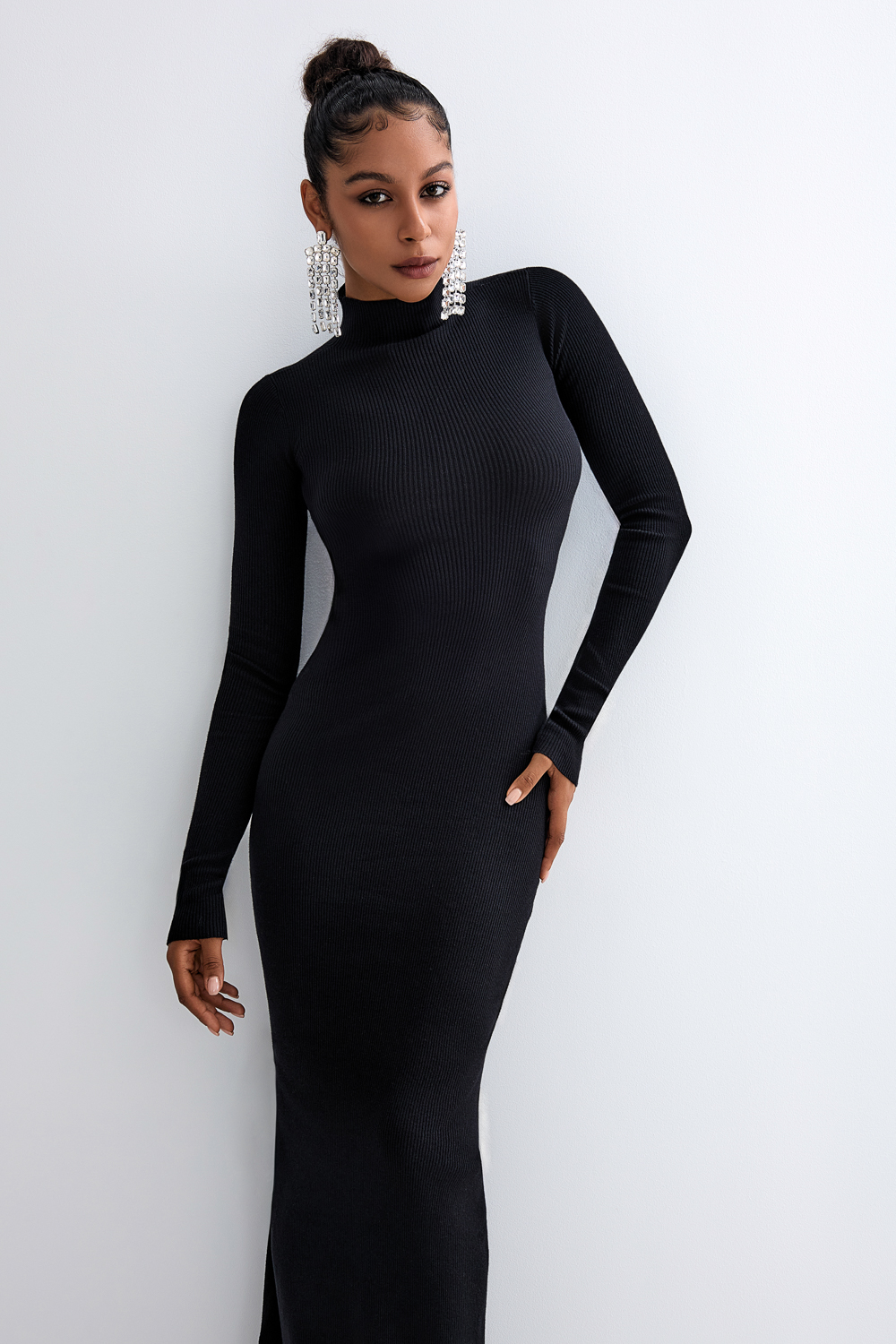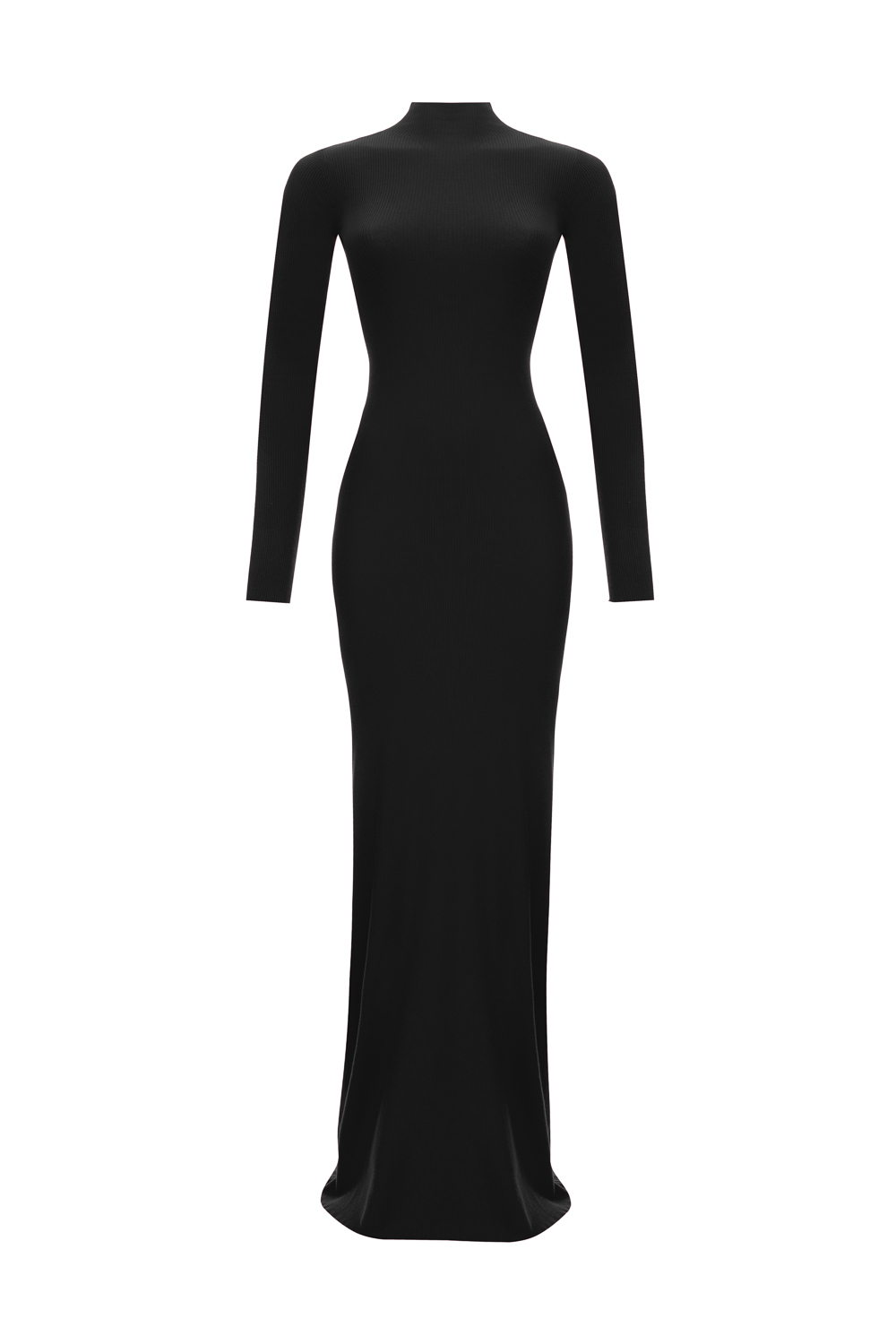 Удлиненное платье, выполненное из вязаного трикотажа. Пряжа с фактурной поверхностью в рубчик. Длина по спинке 160 см, длина рукава 69 см. Состав: 80% хлопок, 20% полиамид.