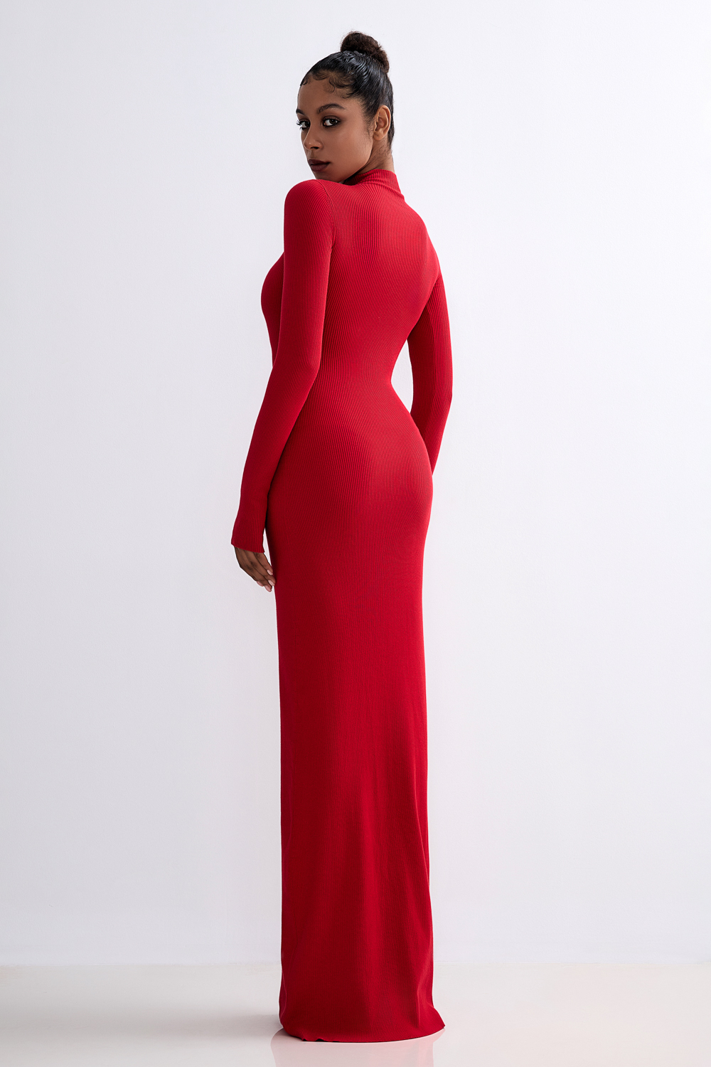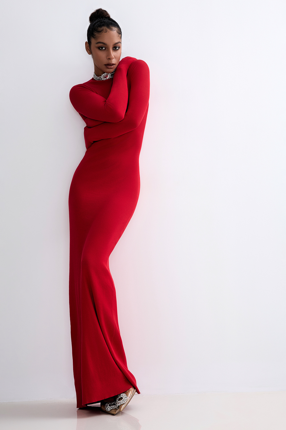 Удлиненное платье, выполненное из вязаного трикотажа. Пряжа с фактурной поверхностью в рубчик. Длина по спинке 160 см, длина рукава 69 см. Состав: 80% хлопок, 20% полиамид.