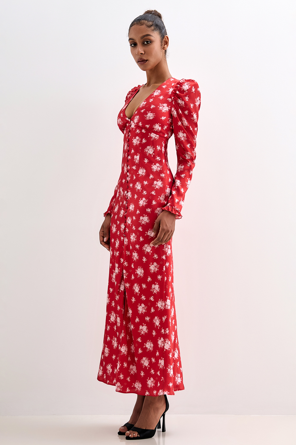 Атласное платье миди с авторским цветочным рисунком и фигурными вытачками на груди. Плечи акцентированы оборками. Застегивается на атласные пуговицы спереди и потайную молнию сзади. Длина по спинке 141 см. На модели размер S. Состав: 100% полиэстер. Подкладка: 97% полиэстер, 3% эластан.