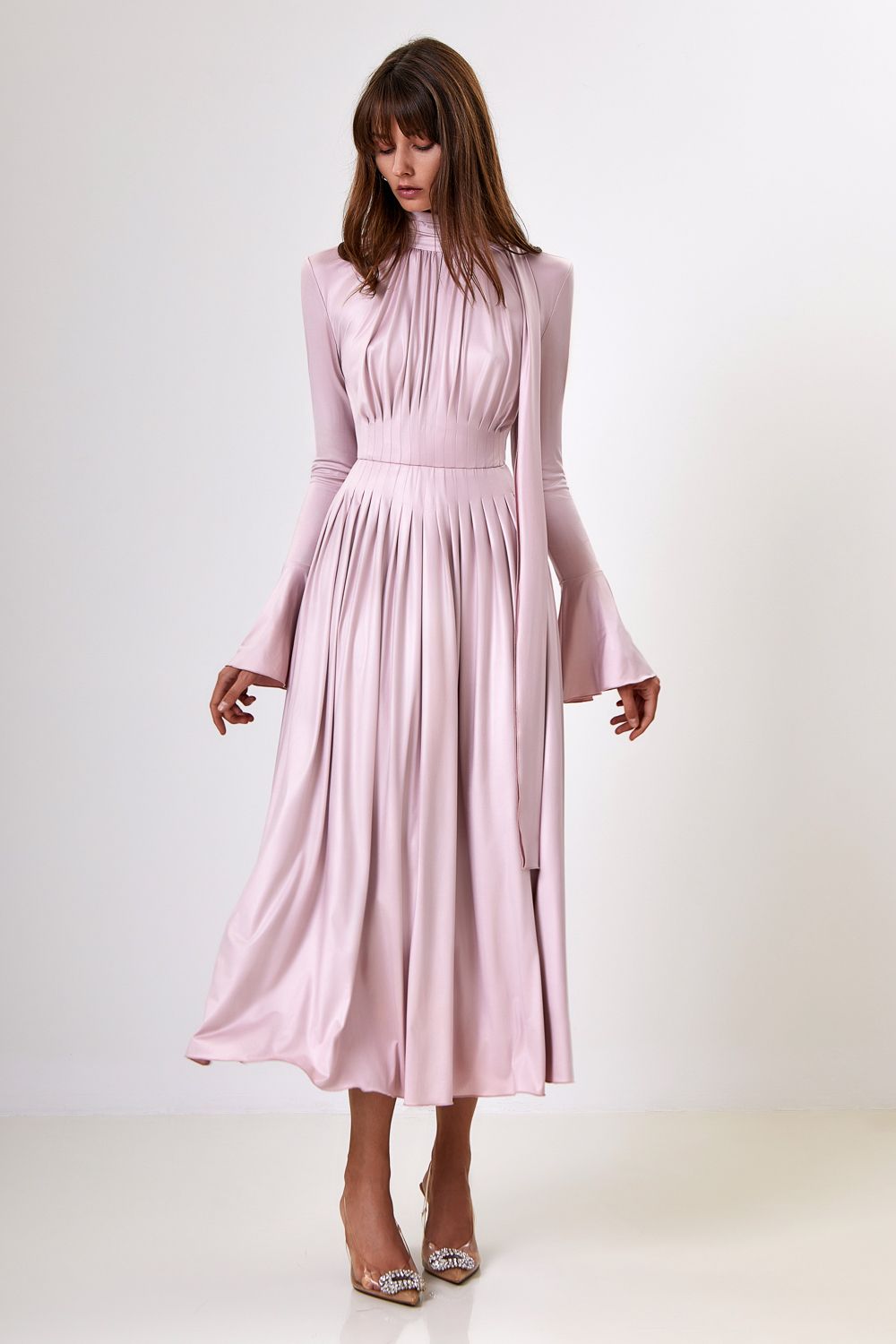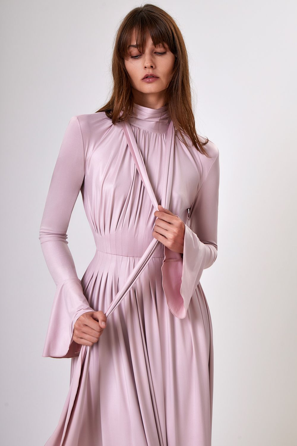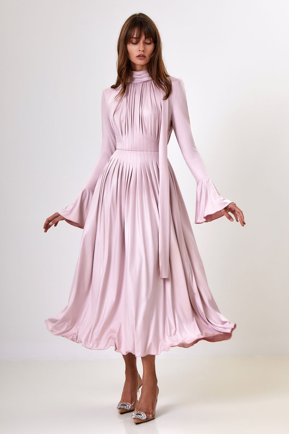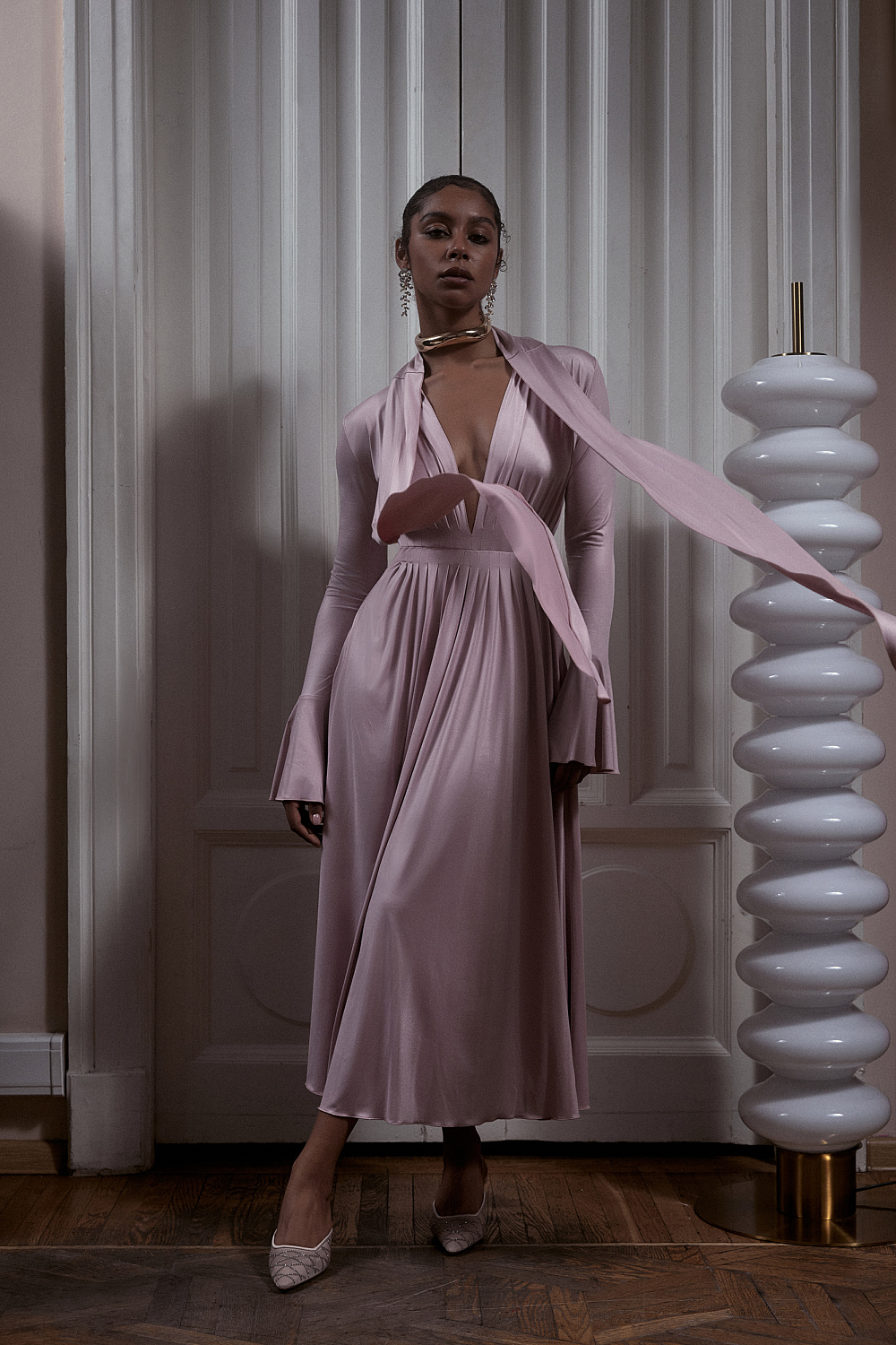 Платье-годе длины миди с овальным вырезом на груди и лентами на задней части шеи, которые можно завязать в бант. Корсет продается отдельно и идеально подойдет к платью. Артикул корсета: 25305. Длина от плеча 130 см. Состав: 92% полиэстер, 8% спандекс.