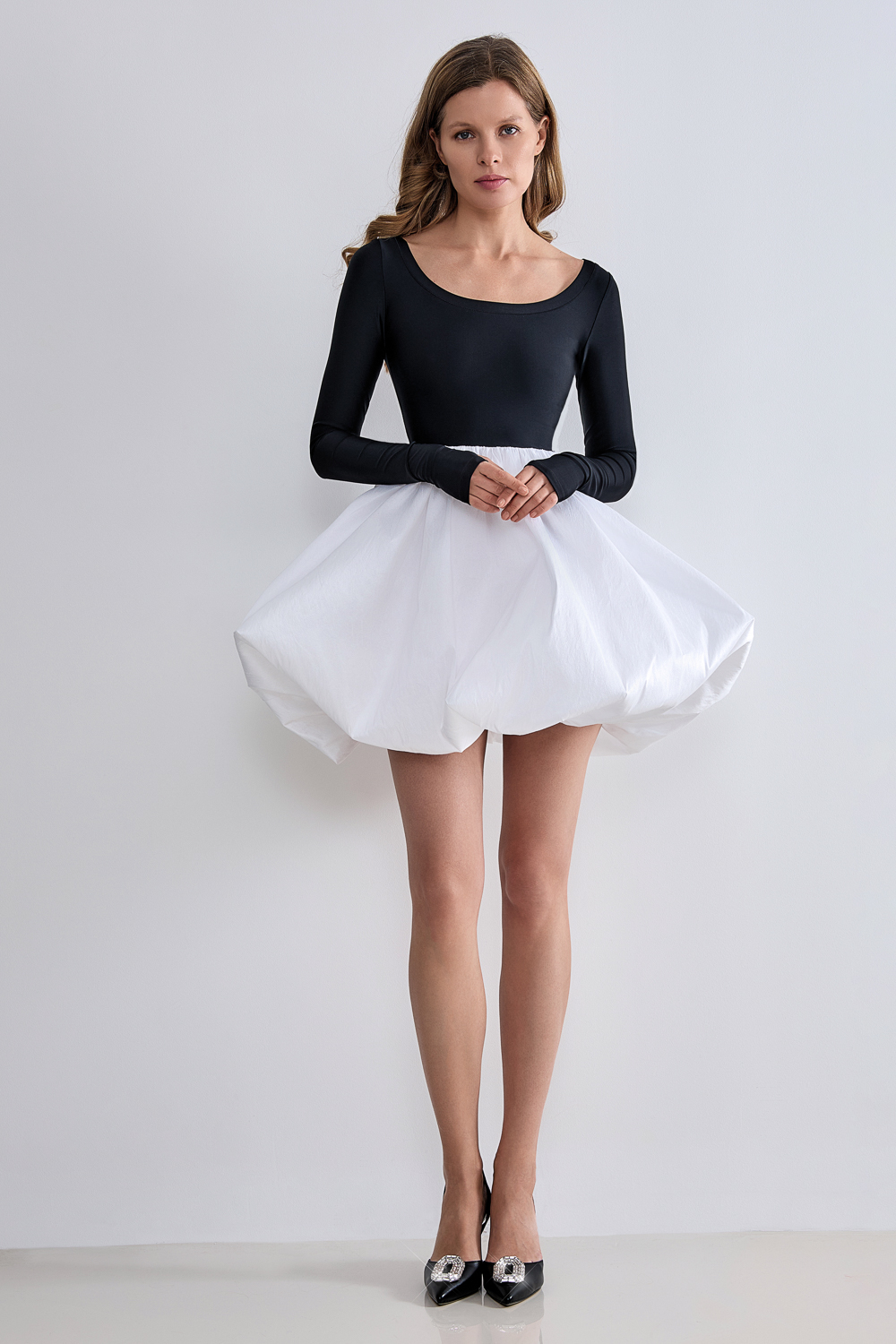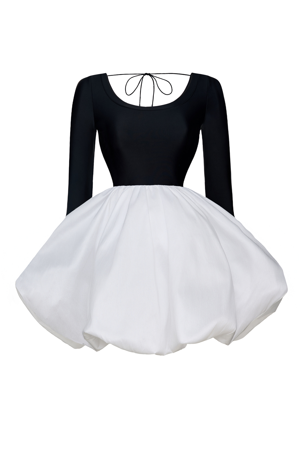 Платье-мини с пышной юбкой и открытой спиной, вдохновленное балетным платьем-пачкой. Длина по спинке 34 см, длина от талии 49 см, длина рукава 70 см. Состав: верх 95% полиэстер, 5% спандекс, низ 88% полиэстер, 12% вискоза. Подкладка: 95% полиэстер, 5% эластан.