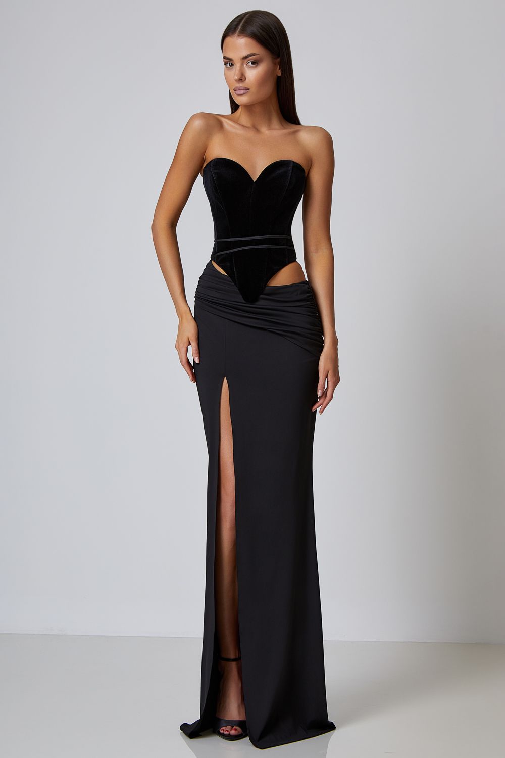 Мягкая юбка макси с заниженной линией талии, изящными ремешками и глубоким разрезом по бедру. Длина по шву 112,5 см. Состав: 92% полиэстер, 8% спандекс.